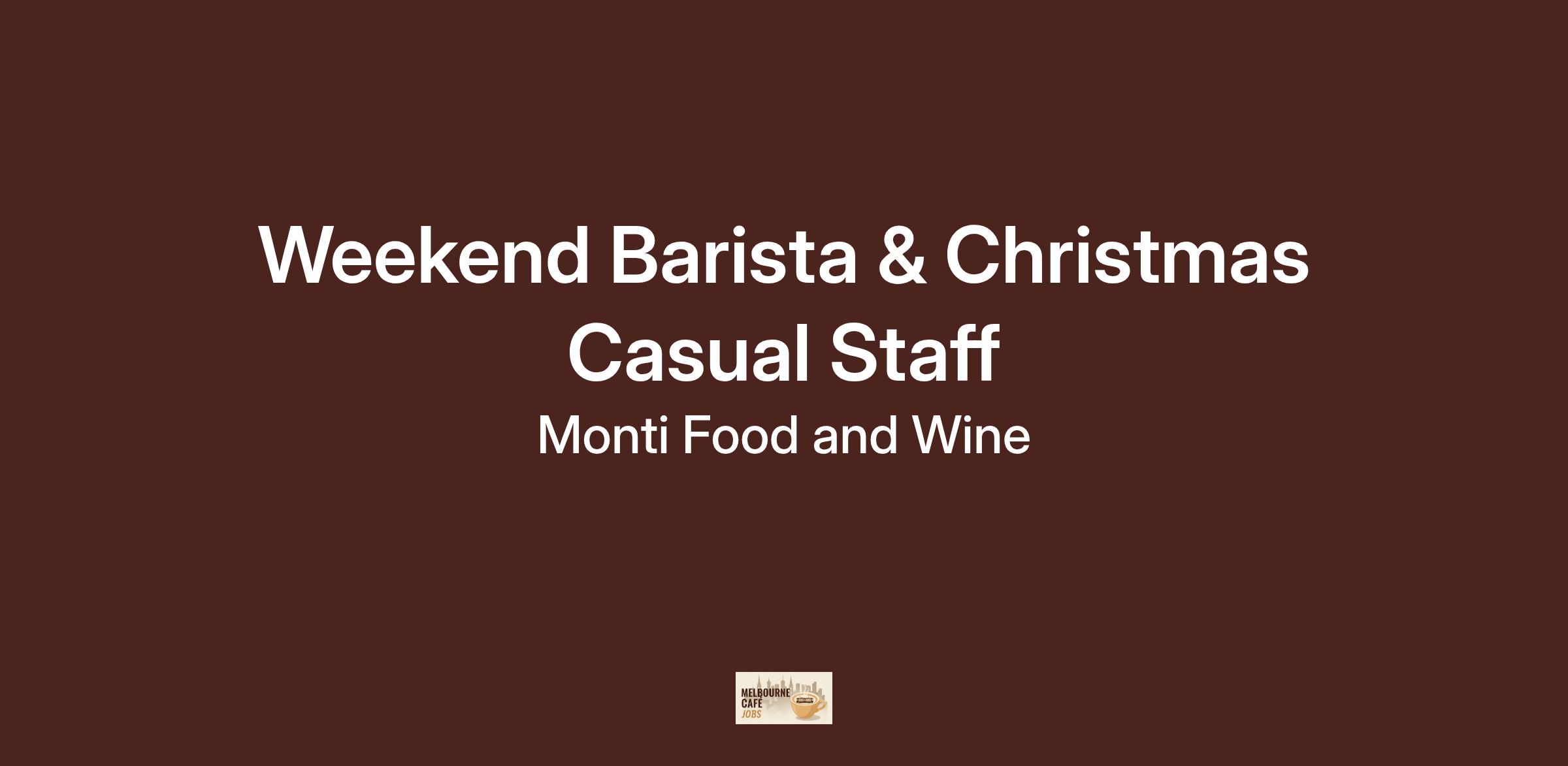Monti Food & Wine (Albert Park) is looking for a weekend barista and Christmas casual staff from 25 Dec – 2 Jan, with a chance to go long-term.